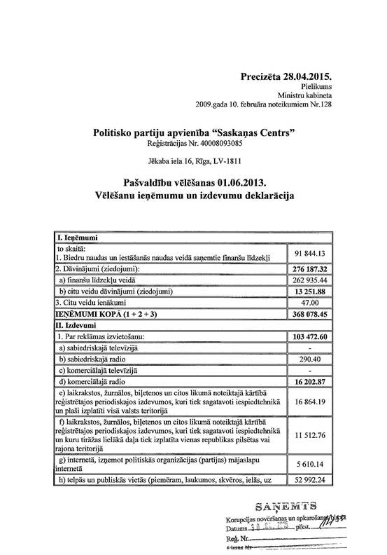 Politisko partiju apvienības "Saskaņas Centrs", reģ. Nr. 40008093085, precizēta 2013.gada 1.jūnija pašvaldību vēlēšanu ieņēmumu un izdevumu deklarācija