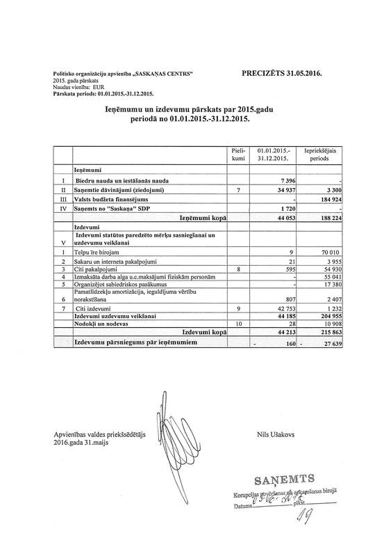 Politisko partiju apvienības "Saskaņas Centrs", reģ. Nr. 40008093085, precizēts ieņēmumu un izdevumu pārskats par 2015. gadu