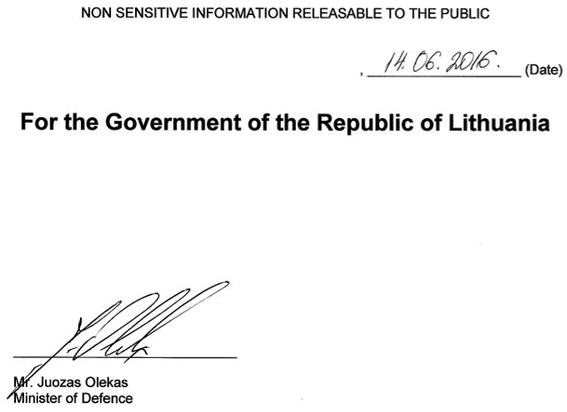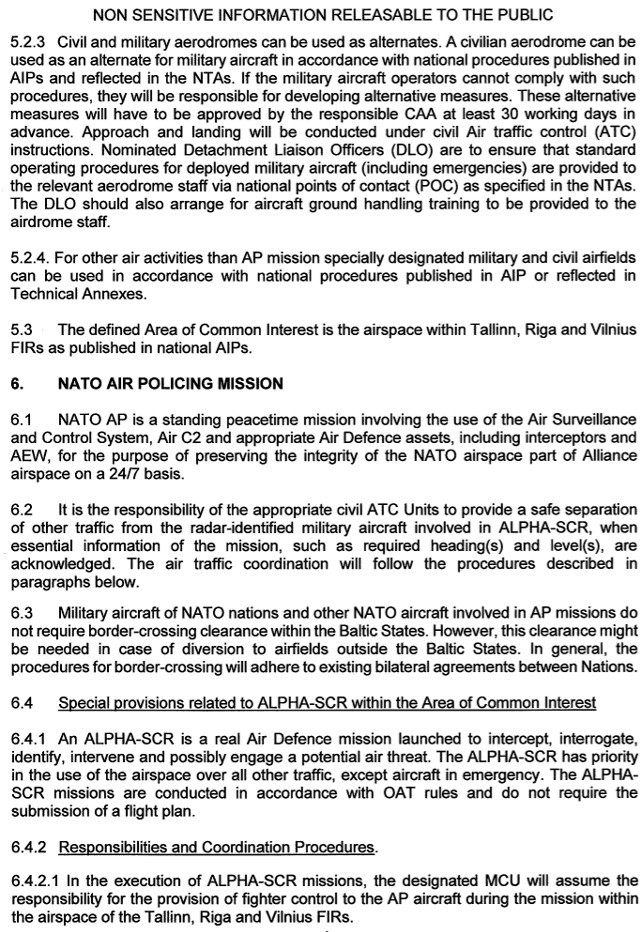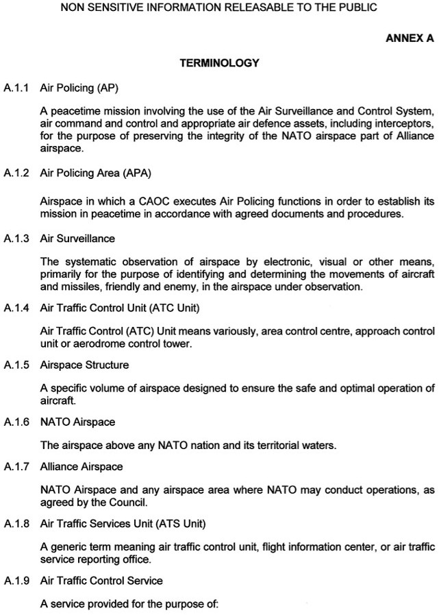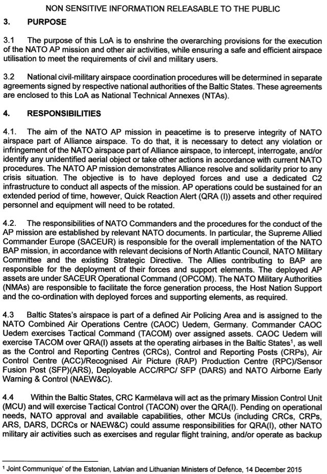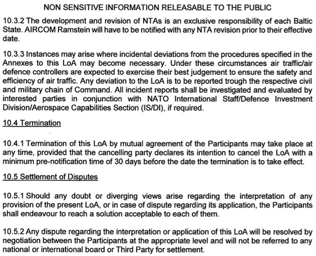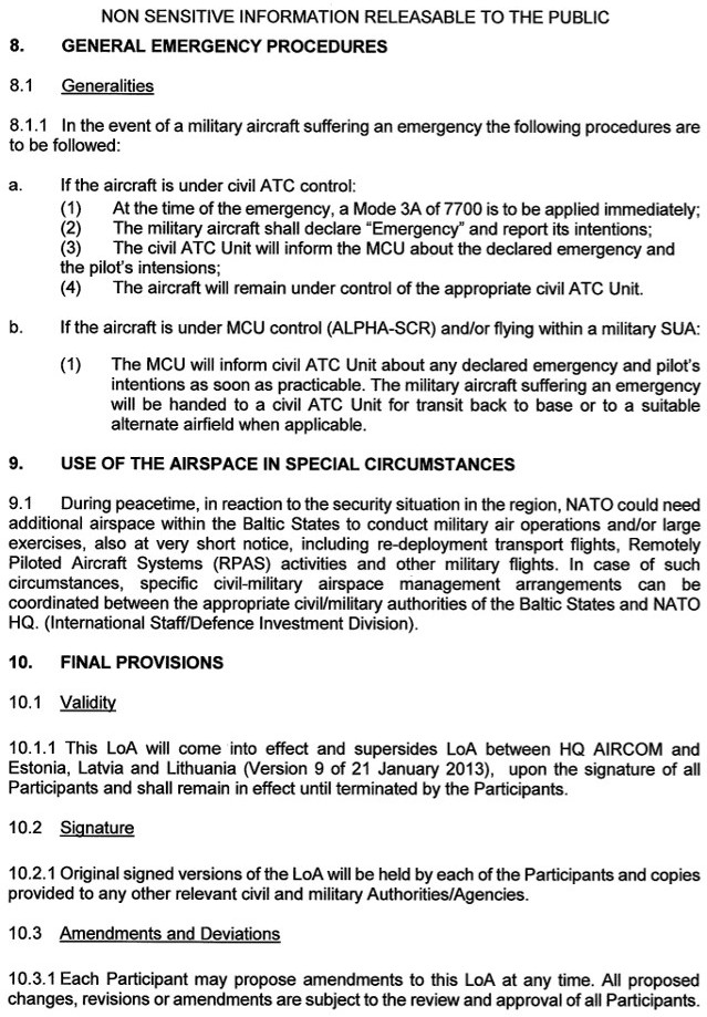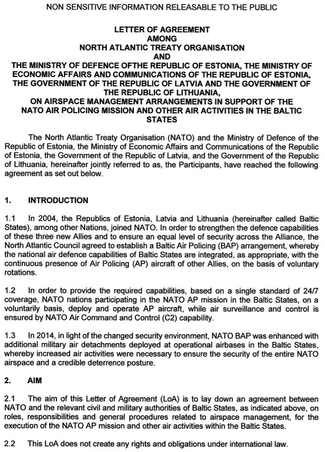 Ārlietu ministrija nosūta publicēšanai Ziemeļatlantijas līguma organizācijas, Igaunijas Republikas Aizsardzības ministrijas, Igaunijas Republikas Ekonomikas lietu un sakaru ministrijas, Latvijas Republikas valdības un Lietuvas Republikas valdības vienošanās dokumentu par gaisa telpas pārvaldības pasākumiem Ziemeļatlantijas līguma organizācijas gaisa telpas patrulēšanas misijas un citu Baltijas valstīs veiktu gaisa spēku darbību atbalstam (turpmāk – Vienošanās dokuments) tekstu angļu valodā. Vienošanās dokuments Latvijā ir apstiprināts ar Ministru kabineta 2016.gada 31.maija noteikumiem Nr.341.