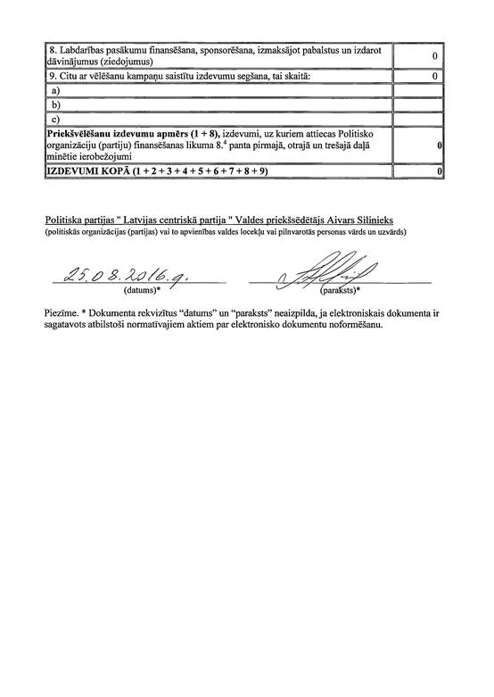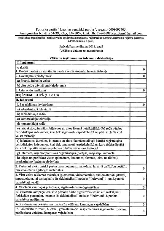 Politiskās partijas "Latvijas centriskā partija", reģ. Nr. 40008095705, 2013. gada pašvaldību vēlēšanu ieņēmumu un izdevumu deklarācija