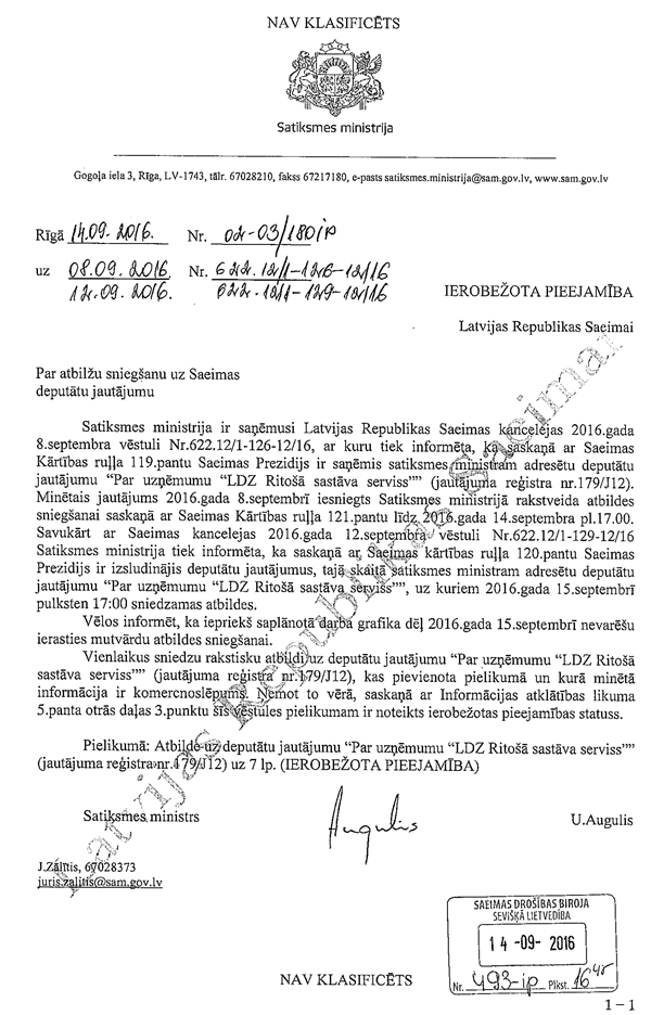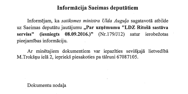 Saistībā ar deputātu Elksniņa, Agešina, Artūra Rubika, Tutina un Ribakova jautājumu satiksmes ministram Uldim Augulim "Par uzņēmumu "LDZ Ritošā sastāva serviss"" saņemtā rakstveida atbilde iesniedzējus apmierina.
