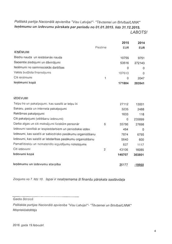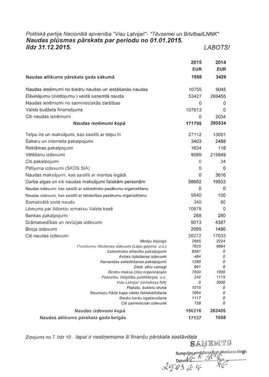 Politiskās partijas "Nacionālā apvienība "Visu Latvijai!" - "Tēvzemei un Brīvībai/LNNK"", reģ. Nr. 40008220045, precizēts gada pārskats par 2015. gadu