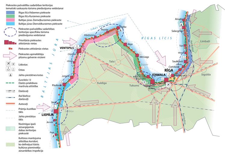 – Liepājas, Ventspils, Jūrmalas un Rīgas pilsētu administratīvo teritoriju daļas, kuras ir tieši saistītas ar piekrastes telpiskās attīstības pamatnostādnēs 2011.–2017.gadam raksturotā piekrastes vienotā dabas un kultūras mantojuma attīstību;