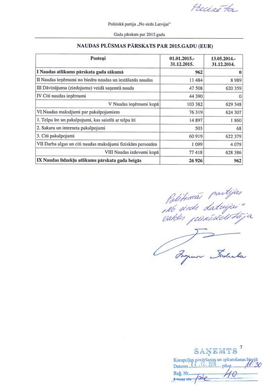 Politiskās partijas "No sirds Latvijai", reģ. Nr. 40008224136, precizēts gada pārskats par 2015. gadu