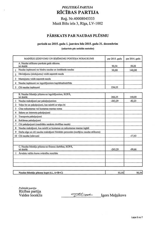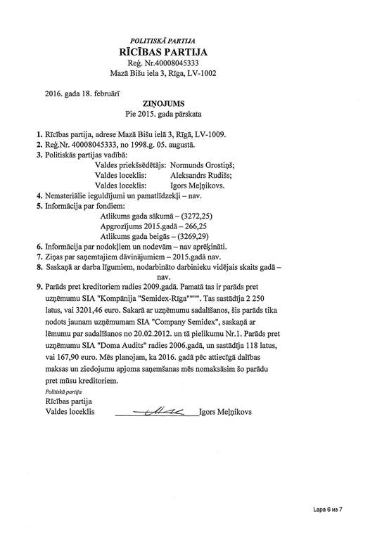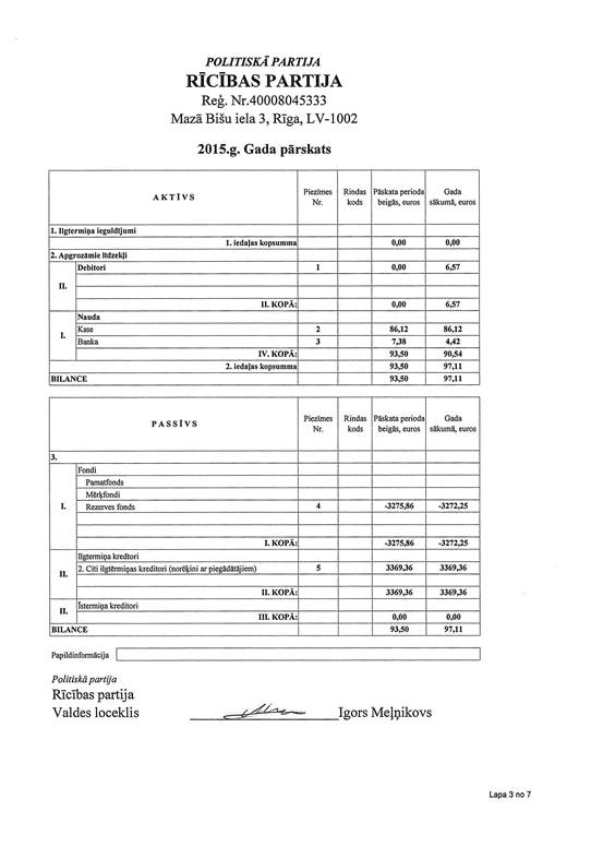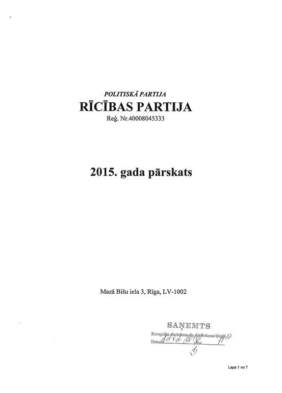 Politiskās partijas "Rīcības partija", reģ. Nr. 40008045333, gada pārskats par 2015.gadu