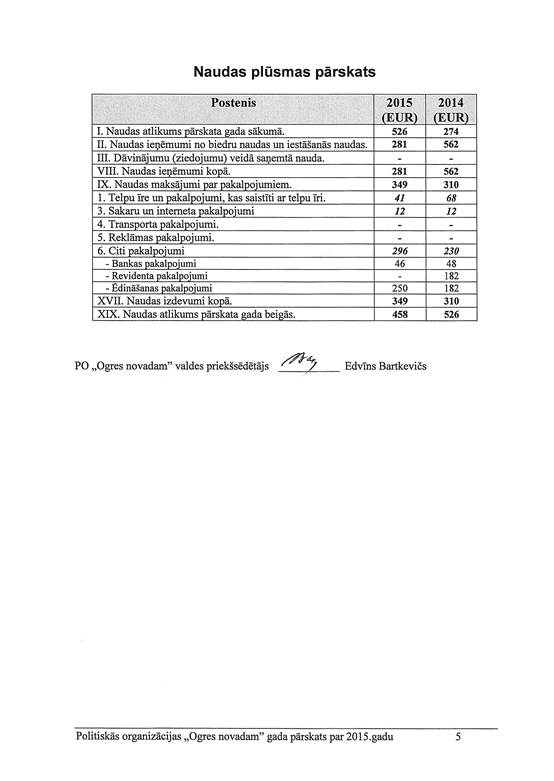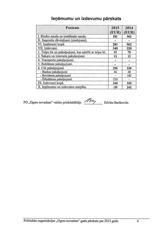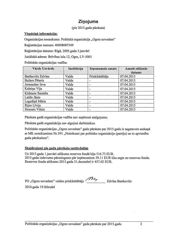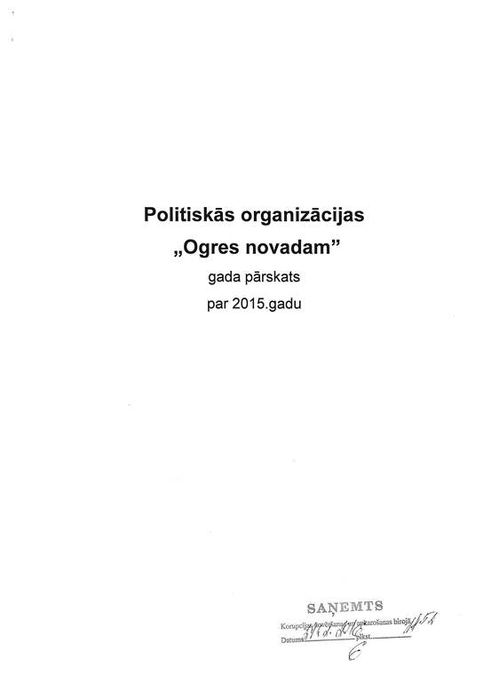 Politiskās partijas "Ogres novadam", reģ. Nr. 40008087549, gada pārskats par 2015.gadu