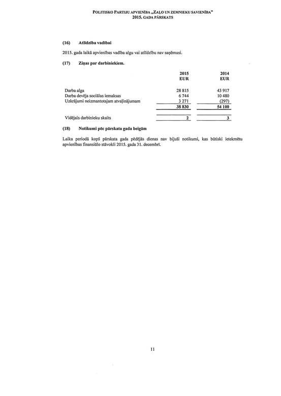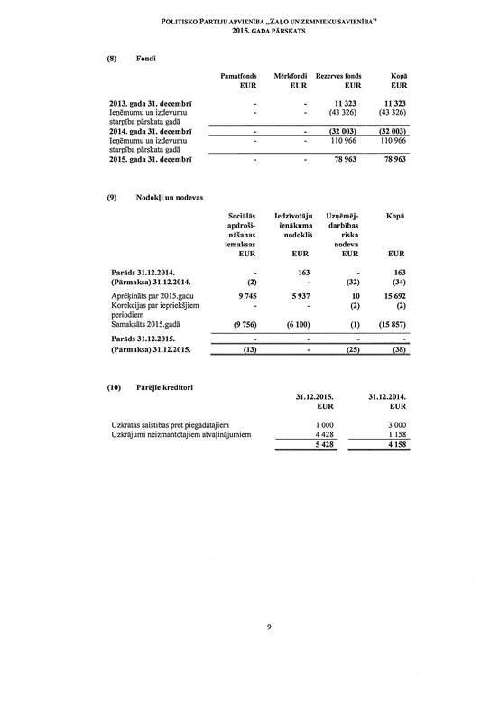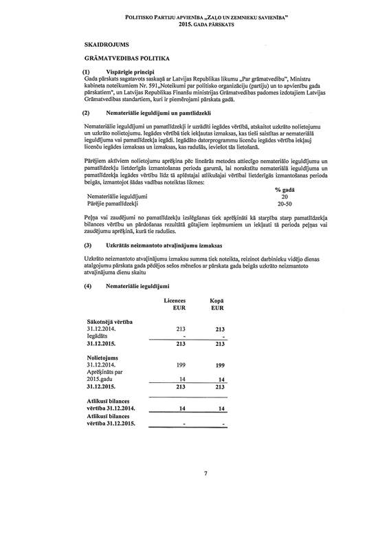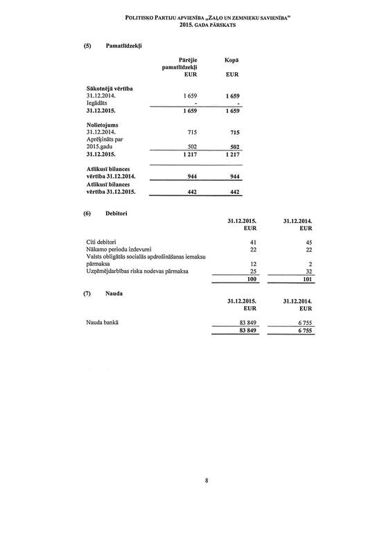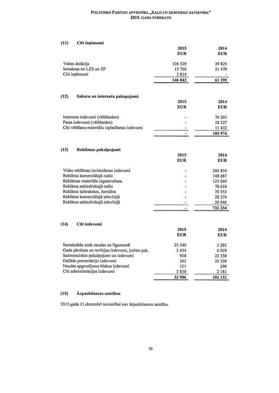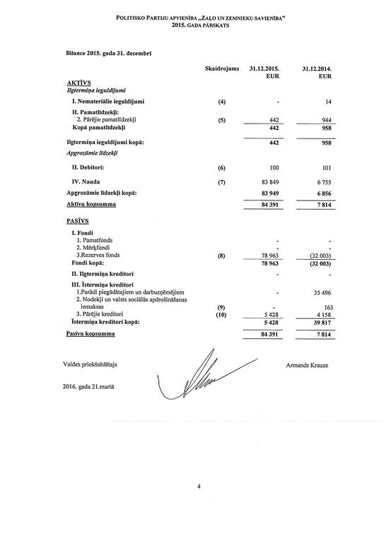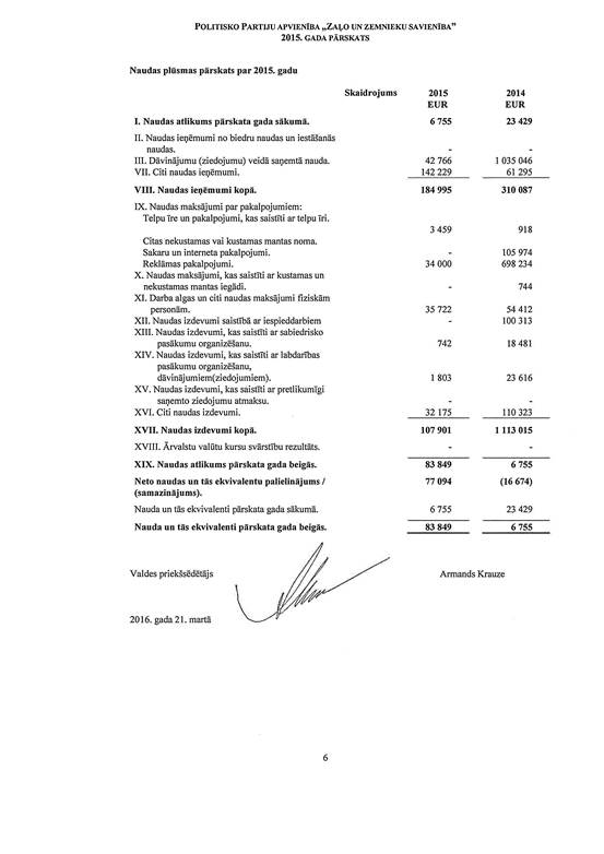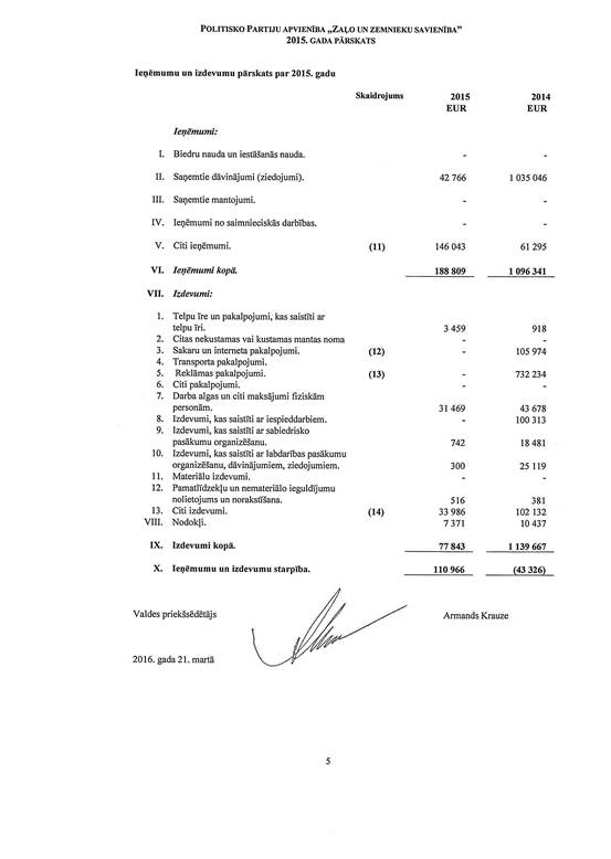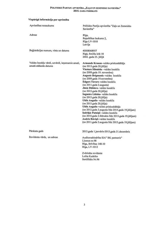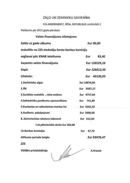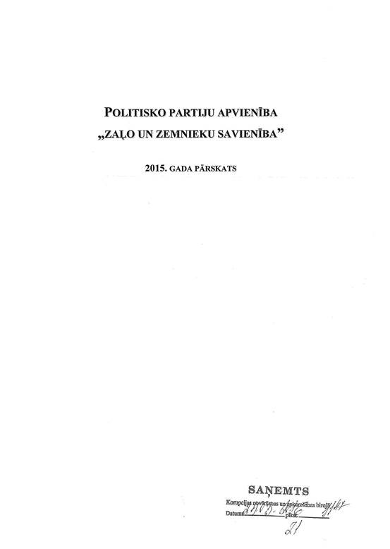 Politisko partiju apvienības "Zaļo un Zemnieku savienība", reģ. Nr. 40008068957, gada pārskats par 2015.gadu