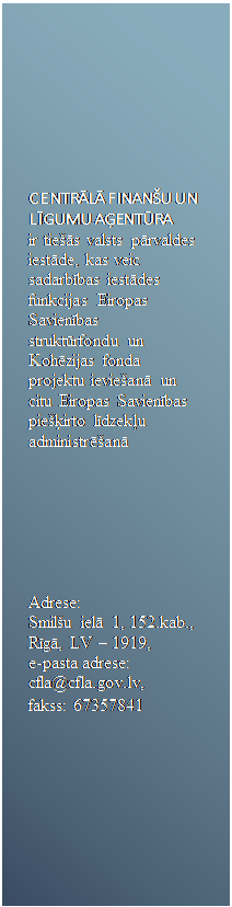 Ja Tevi ieinteresēja mūsu piedāvājums un darba saturs un vēlies būt viens no mums, aicinām savu CV, motivācijas vēstuli un augstāko izglītību apliecinošu dokumentu kopijas desmit dienu laikā no paziņojuma publicēšanas oficiālajā izdevumā "Latvijas Vēstnesis" sūtīt Centrālajai finanšu un līgumu aģentūrai ar norādi "Konkurss - Programmu vadības un metodikas nodaļas vecākais eksperts".