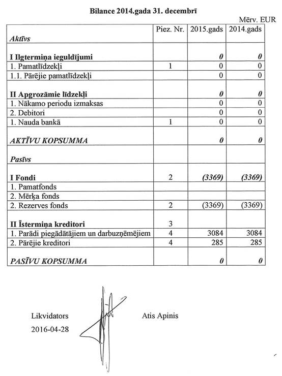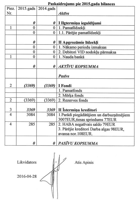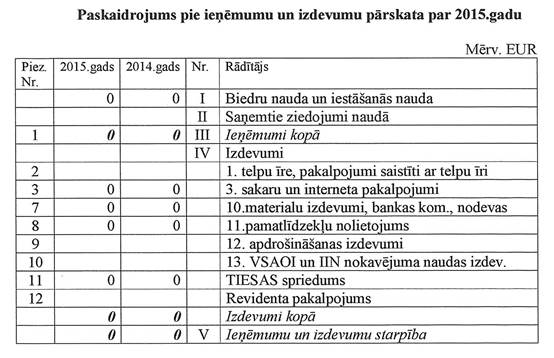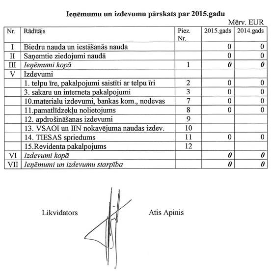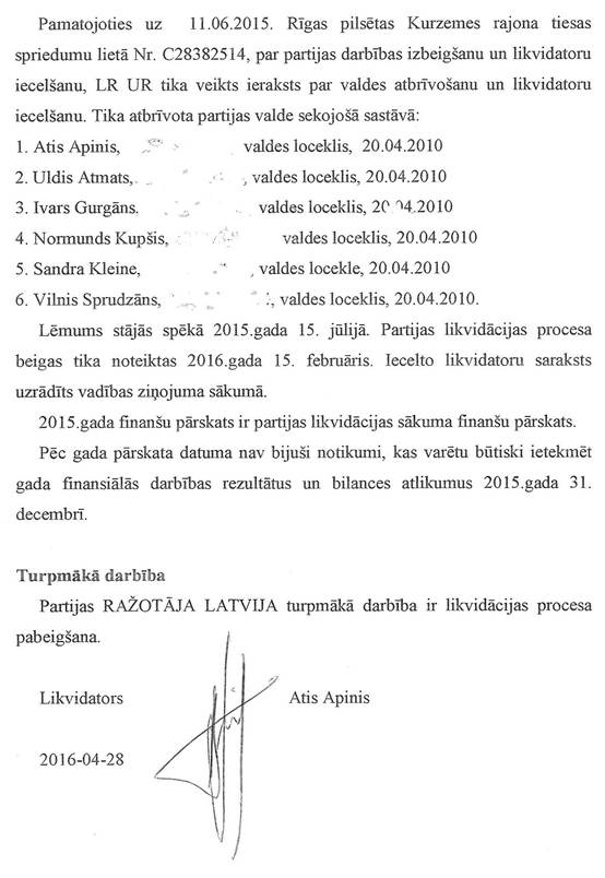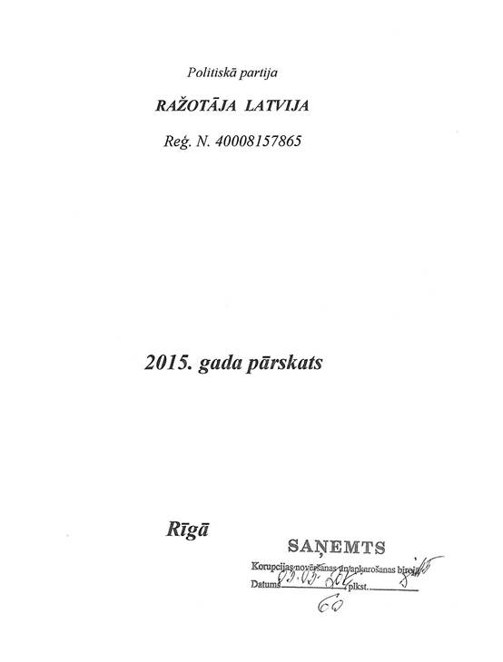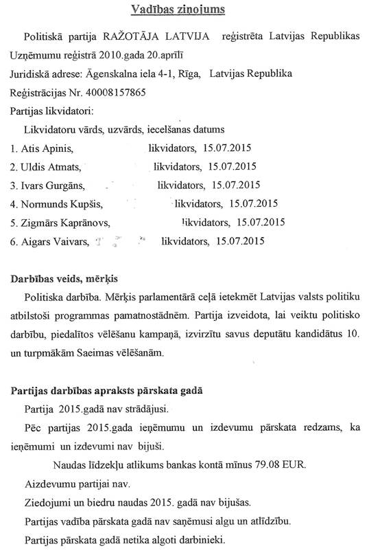 Likvidējamās politiskās partijas "Ražotāja Latvija", reģ. Nr. 40008157865, gada pārskats par 2015. gadu
