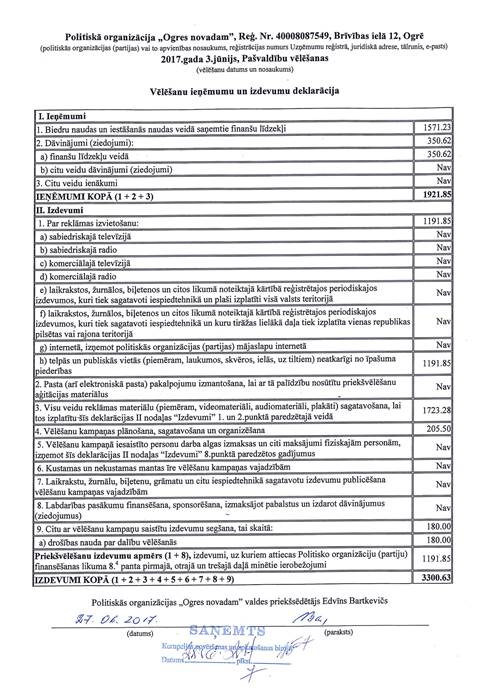 Politiskās partijas "OGRES NOVADAM", reģ. Nr. 40008087549, vēlēšanu ieņēmumu un izdevumu deklarācija
