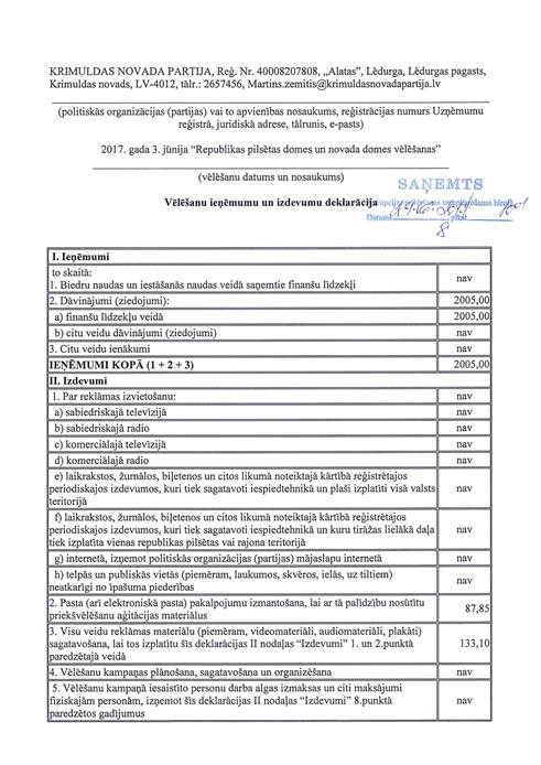 Politiskās partijas "KRIMULDAS NOVADA PARTIJA", reģ. Nr. 40008207808, vēlēšanu ieņēmumu un izdevumu deklarācija