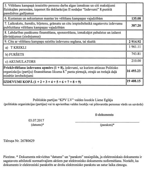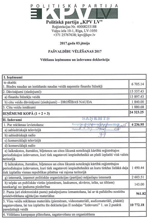 Politiskās partijas "KPV LV", reģ. Nr.40008253188, vēlēšanu ieņēmumu un izdevumu deklarācija