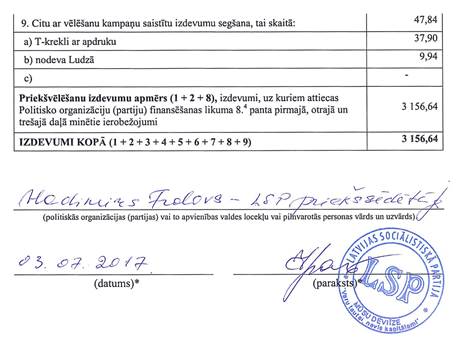 Politiskās partijas "Latvijas Sociālistiskā partija", reģ. Nr. 50008045621, vēlēšanu ieņēmumu un izdevumu deklarācija