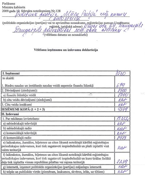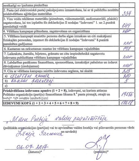 Politiskās partijas "MŪSU PARTIJA", reģ. Nr.40008191136, vēlēšanu ieņēmumu un izdevumu deklarācija