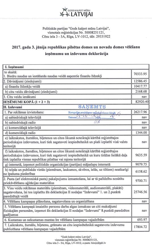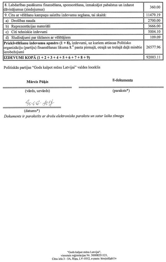Politiskās partijas "Gods kalpot mūsu Latvijai", reģ. Nr.50008251121, vēlēšanu ieņēmumu un izdevumu deklarācija