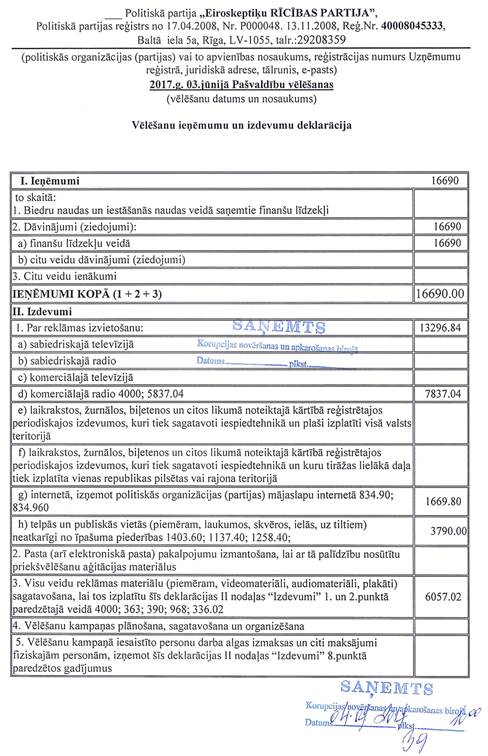 Politiskās partijas "Eiroskeptiķu Rīcības partija", reģ. Nr. 40008045333, vēlēšanu ieņēmumu un izdevumu deklarācija
