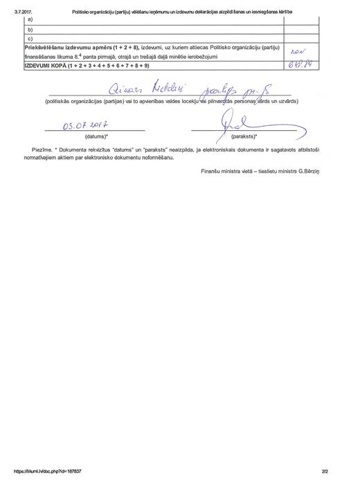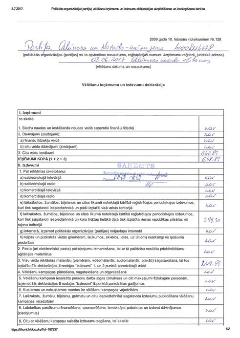 Politiskās partijas "Alūksne un novads - mūsu zeme", reģ. Nr.40008214778, vēlēšanu ieņēmumu un izdevumu deklarācija