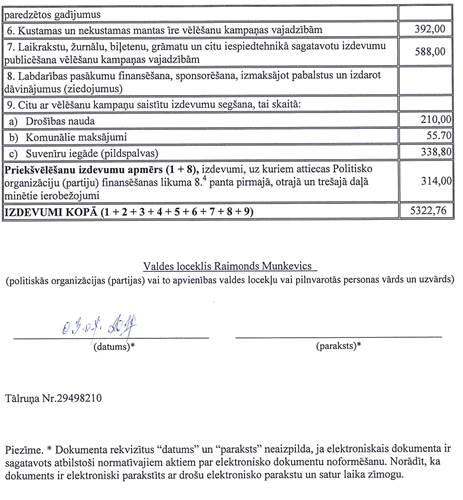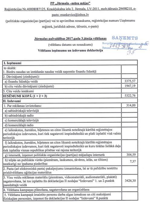 Politiskās partijas "Jūrmala - mūsu mājas", reģ. Nr.40008087125, vēlēšanu ieņēmumu un izdevumu deklarācija