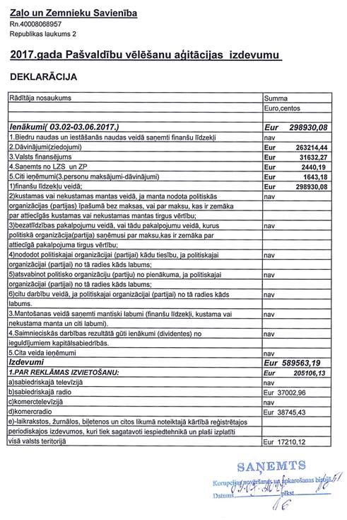 Politisko partiju apvienības "Zaļo un Zemnieku savienība", reģ. Nr.40008068957, vēlēšanu ieņēmumu un izdevumu deklarācija