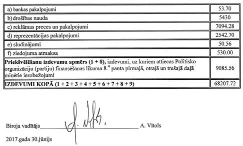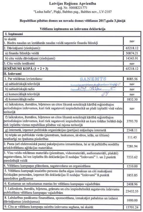 Politisko partiju apvienības "Latvijas Reģionu Apvienība", reģ. Nr.50008221771, vēlēšanu ieņēmumu un izdevumu deklarācija