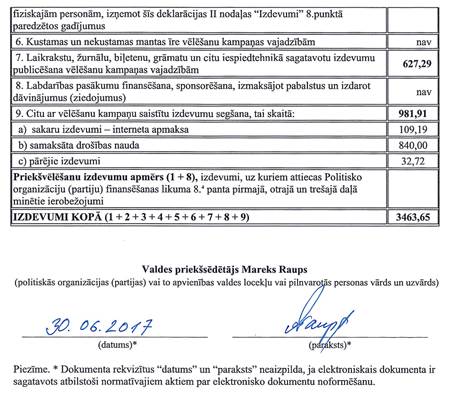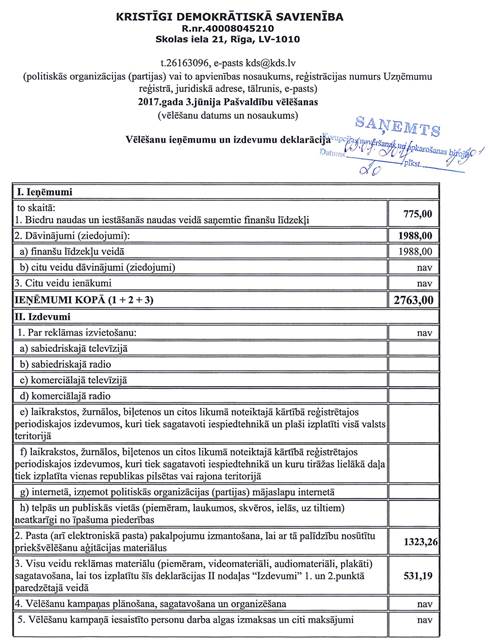 Politiskās partijas "Kristīgi demokrātiskā savienība", reģ. Nr.40008045210, vēlēšanu ieņēmumu un izdevumu deklarācija