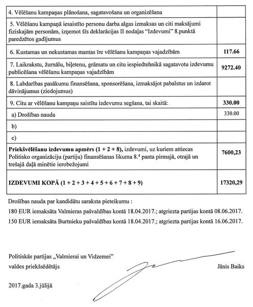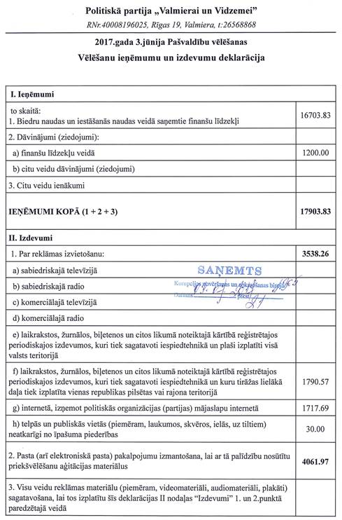 Politiskās partijas "Valmierai un Vidzemei", reģ. Nr. 40008196025, vēlēšanu ieņēmumu un izdevumu deklarācija
