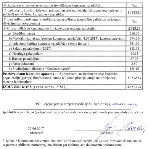 PO LIEPĀJAS PARTIJA, reģ. Nr.40008087572, vēlēšanu ieņēmumu un izdevumu deklarācija