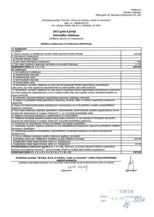 Politiskās partijas "Brīvība. Brīvs no bailēm, naida un dusmām", reģ. Nr. 40008182133, vēlēšanu ieņēmumu un izdevumu deklarācija