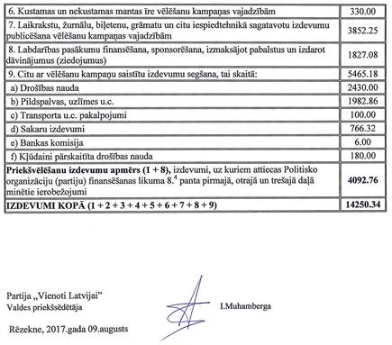Politiskās partijas "Partija "Vienoti Latvijai"", reģ. Nr. 40008198204, precizēta vēlēšanu ieņēmumu un izdevumu deklarācija