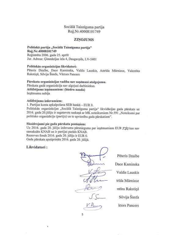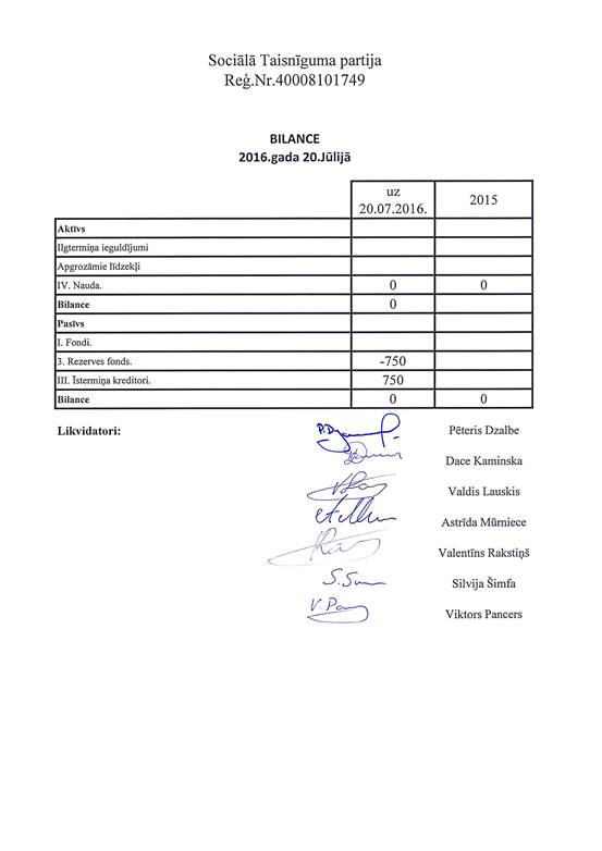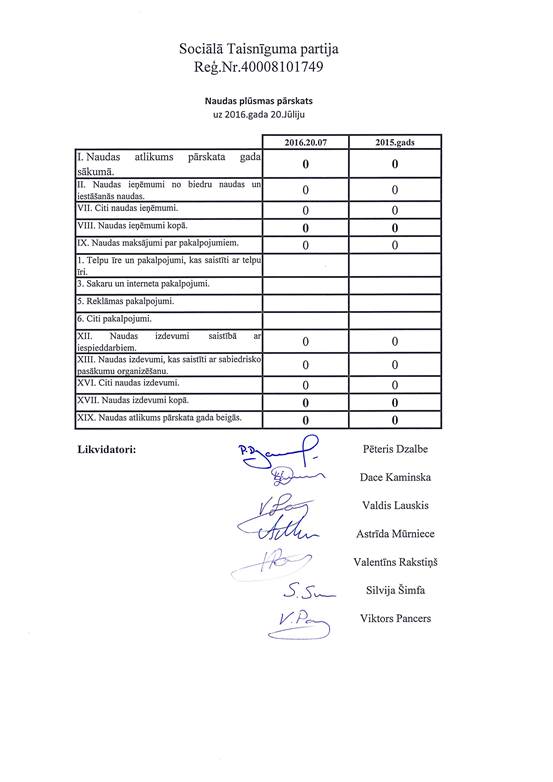 Politiskās partijas "Sociālā Taisnīguma partija", reģ. Nr. 40008101749, precizēts likvidācijas gada pārskats par 2016. gadu