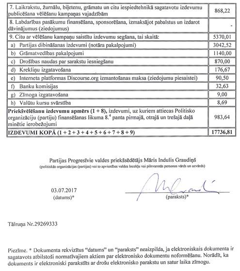 Politiskās partijas "PROGRESĪVIE", reģ. Nr. 40008262104, precizēta vēlēšanu ieņēmumu un izdevumu deklarācija