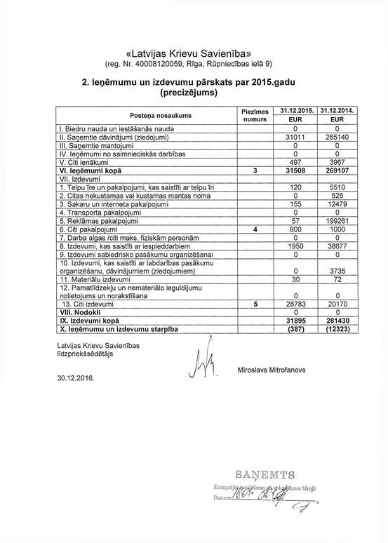 Politiskās partijas "Latvijas Krievu savienība", reģ. Nr. 40008120059, precizēts ieņēmumu un izdevumu pārskats par 2015. gadu