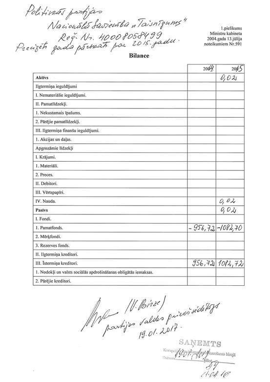Politiskās partijas "Nacionālā Savienība TAISNĪGUMS", reģ. Nr. 40008058499, precizēts gada pārskats par 2015. gadu