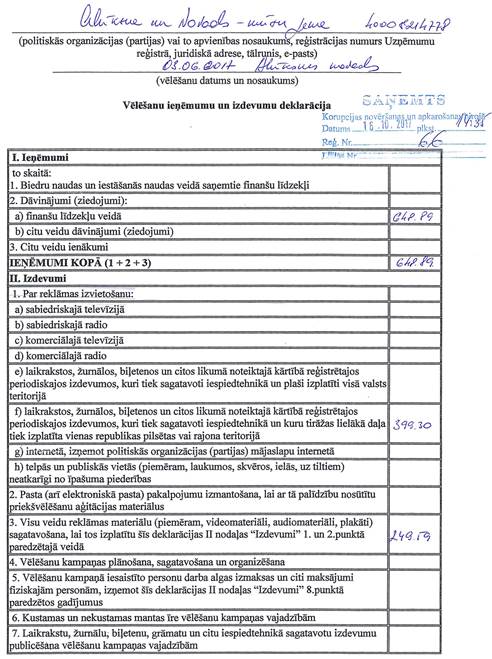 Politiskās partijas "Alūksne un novads - mūsu zeme", reģ. Nr. 40008214778, precizēta vēlēšanu ieņēmumu un izdevumu deklarācija