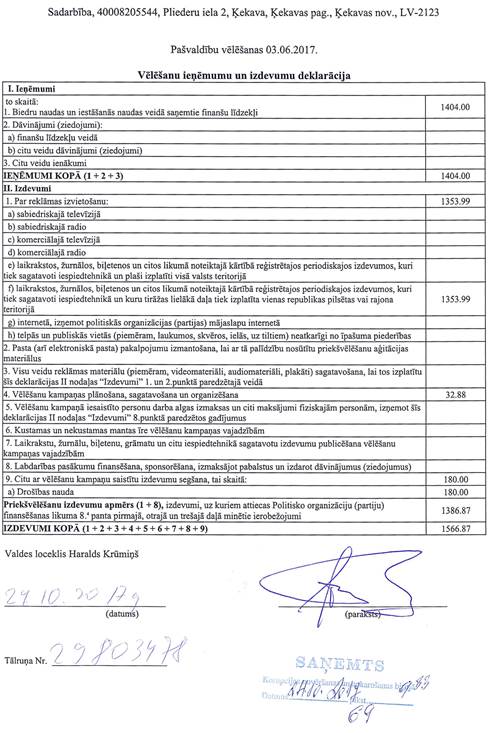 Politiskās partijas "Sadarbība", reģ. Nr. 40008205544, vēlēšanu ieņēmumu un izdevumu deklarācija