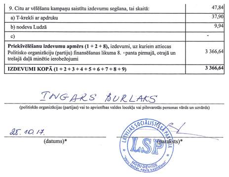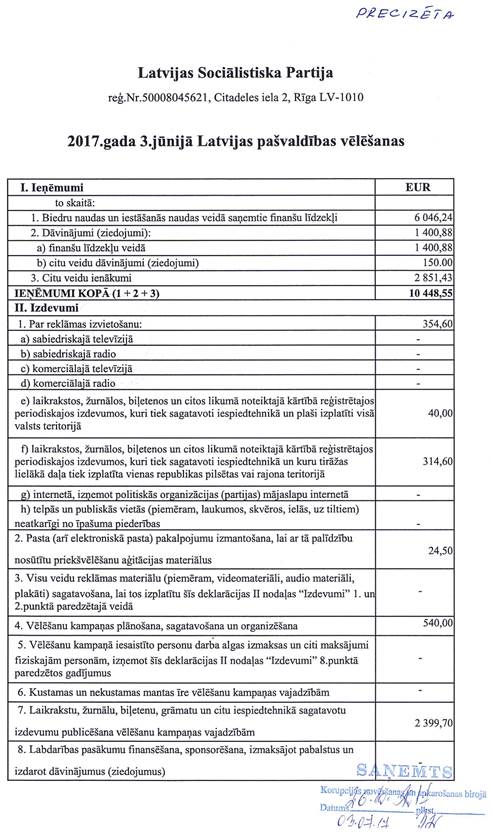 Politiskās partijas "Latvijas Sociālistiskā partija", reģ. Nr. 50008045621, precizēta vēlēšanu ieņēmumu un izdevumu deklarācija