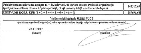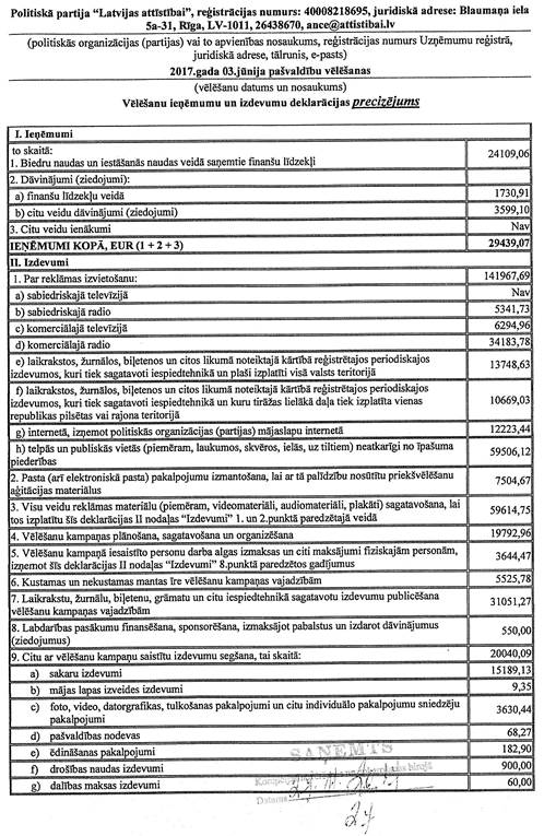 Politiskās partijas "Latvijas attīstībai", reģ. Nr. 40008218695, precizēta vēlēšanu ieņēmumu un izdevumu deklarācija
