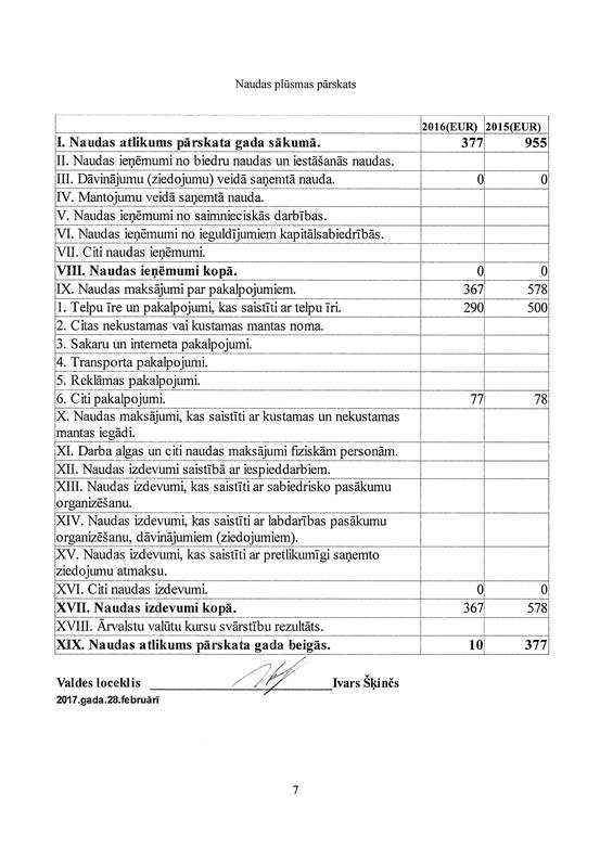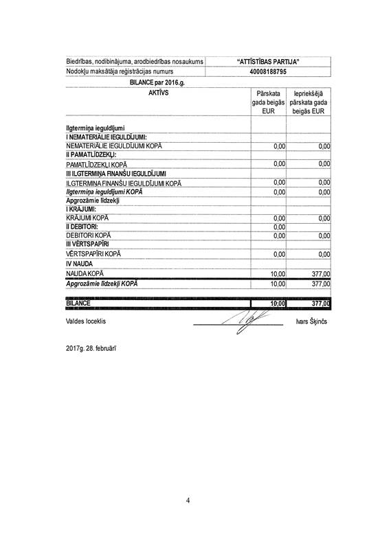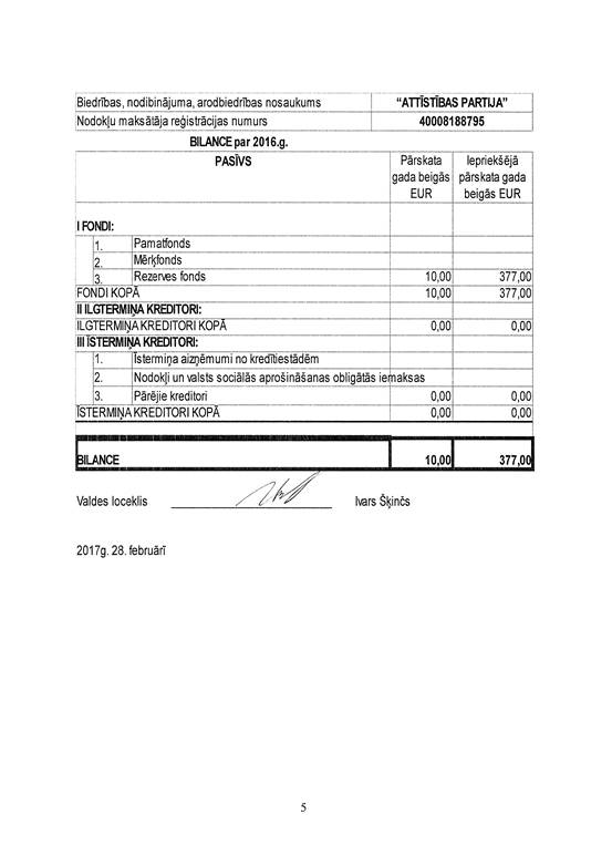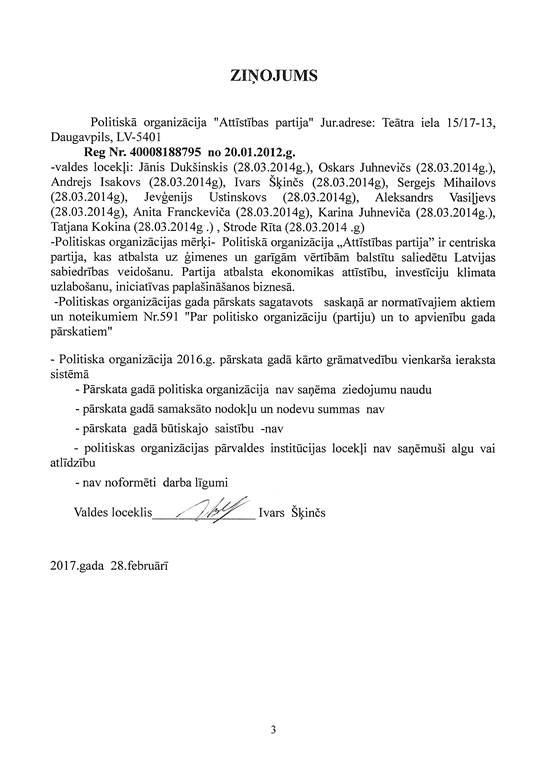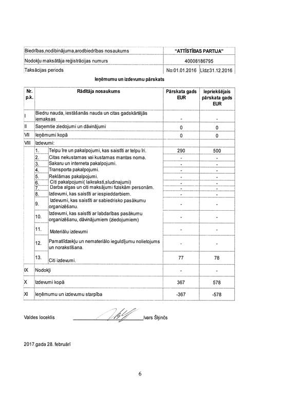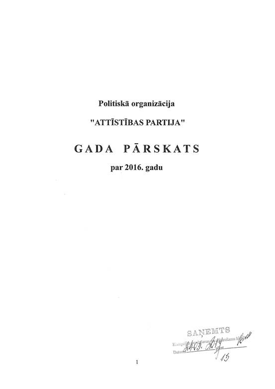 Politiskās partijas "Attīstības partija", reģ. Nr. 40008188795, gada pārskats par 2016. gadu