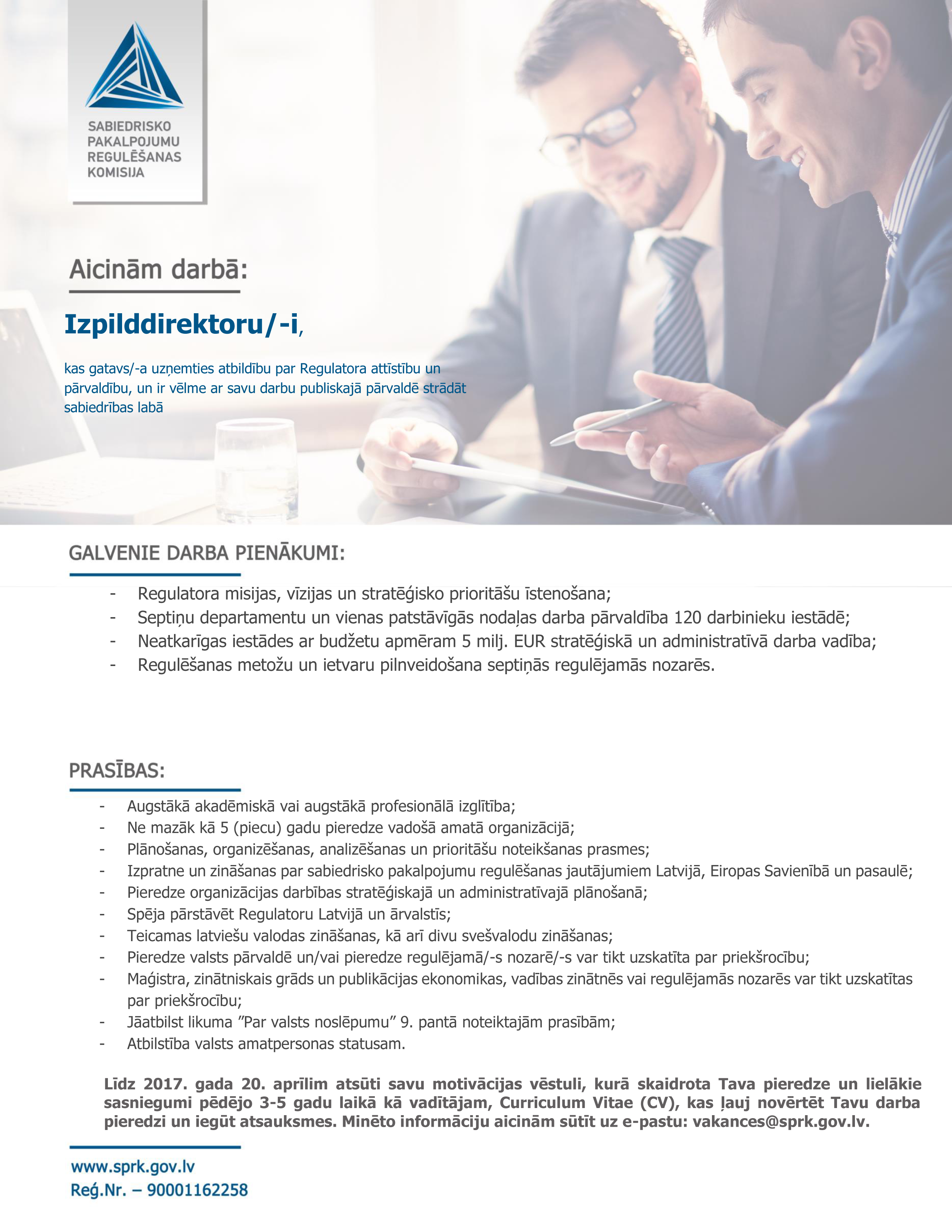 SABIEDRISKO PAKALPOJUMU REGULĒŠANAS KOMISIJA AICINA DARBĀ IZPILDDIREKTORU/-I