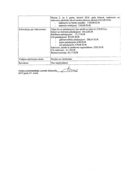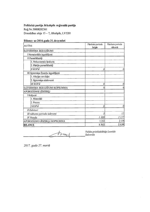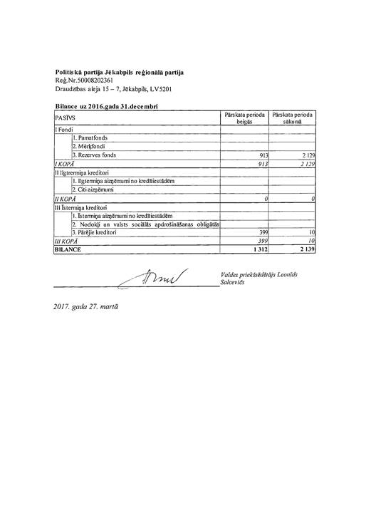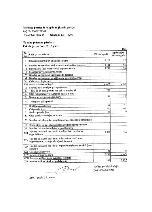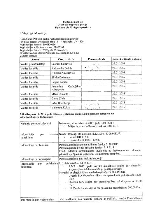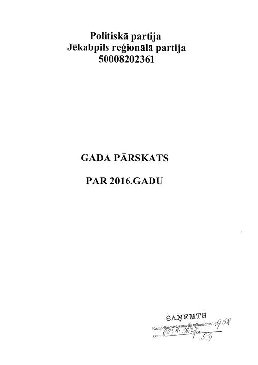 Politiskās partijas "JĒKABPILS REĢIONĀLĀ PARTIJA", reģ. Nr. 50008202361, gada pārskats par 2016. gadu