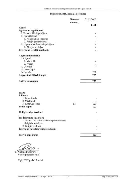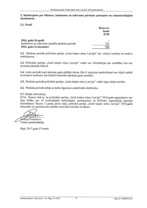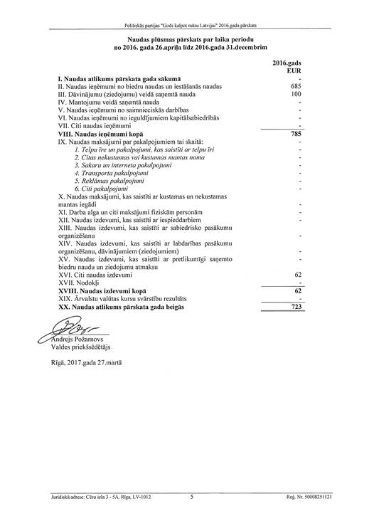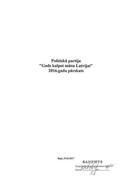 Politiskās partijas "Gods kalpot mūsu Latvijai", reģ. Nr. 50008251121, gada pārskats par 2016. gadu