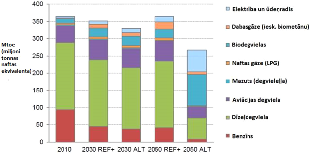 6 Prognozes saskaņā ar pašreizējām tendencēm un pieņemtajiem politiskajiem lēmumiem – "ES References scenārijs 2013" (EU Reference scenario 2013), bet arī dažas papildu politikas, piemēram Clean Power for Transport Package. Detalizēts apraksts par "ES References scenāriju" ir pieejams: http://ec.europa.eu/transport/media/publications/doc/trends-to-2050-update-2013.pdf