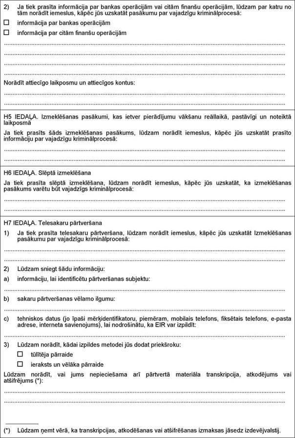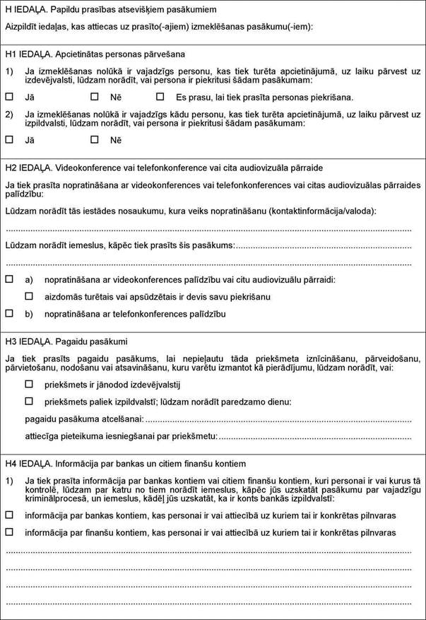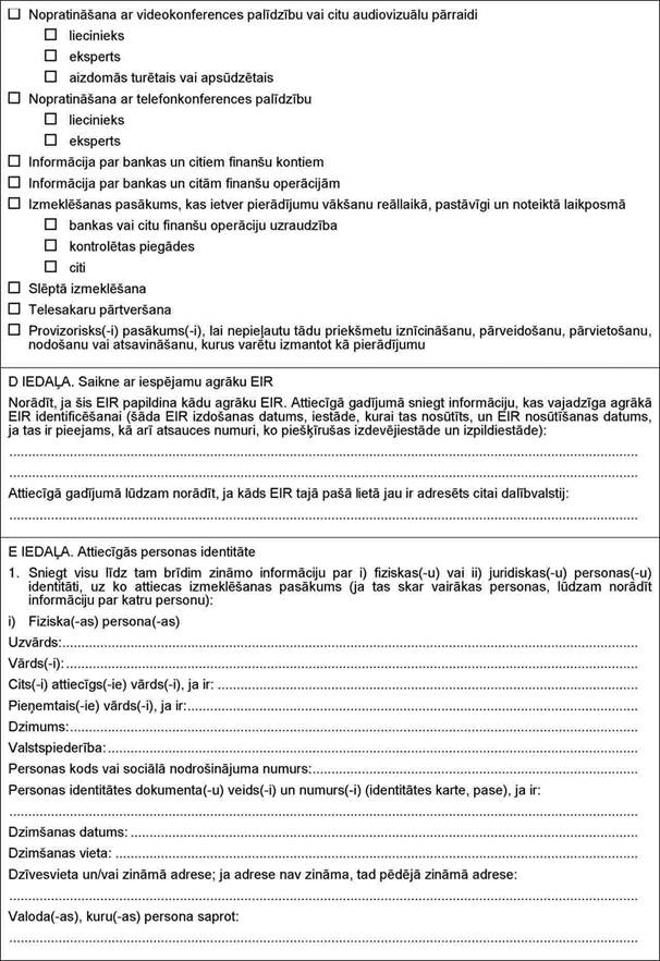 "2.13. procesuālās darbības veikšanai pierādījumu iegūšanai – Eiropas izmeklēšanas rīkojumu, kas paredzēts Eiropas Parlamenta un Padomes 2014. gada 3. aprīļa Direktīvā 2014/41/ES par Eiropas izmeklēšanas rīkojumu krimināllietās (13. pielikums);