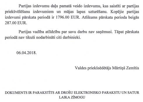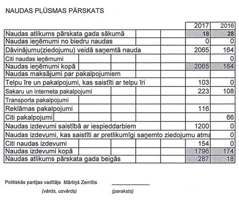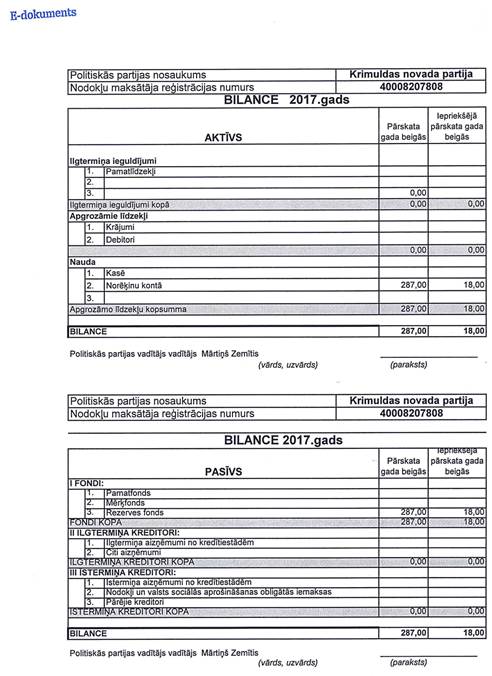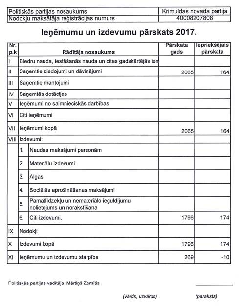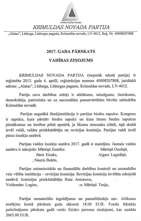 Politiskās partijas "KRIMULDAS NOVADA PARTIJA", reģistrācijas numurs 40008207808, gada pārskats par 2017. gadu