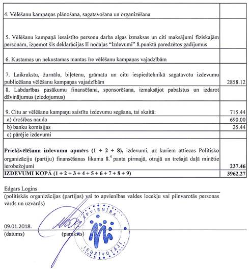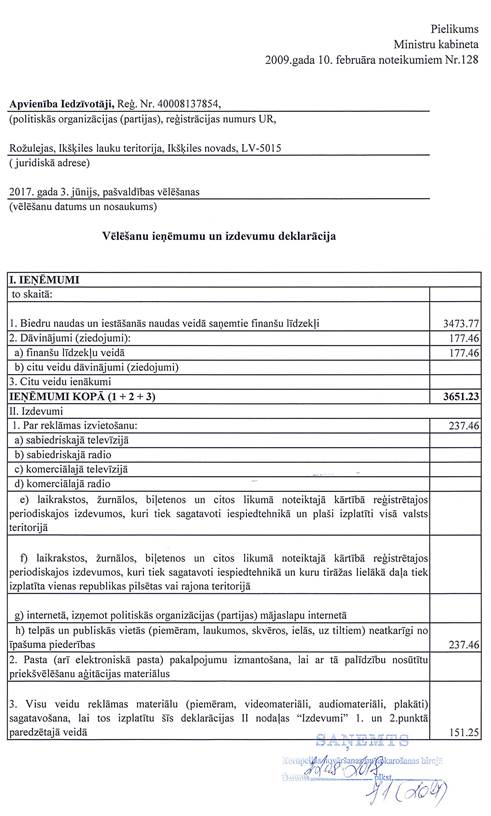 Politiskās partijas "Apvienība Iedzīvotāji", reģ. Nr. 40008137854, precizēta vēlēšanu ieņēmumu un izdevumu deklarācija