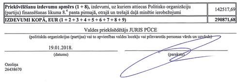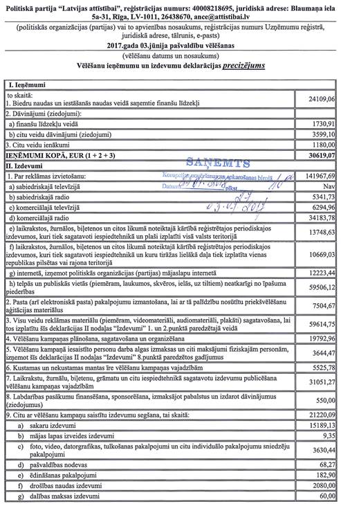 Politiskās partijas "Latvijas attīstībai", reģ. Nr. 40008218695, precizēta vēlēšanu ieņēmumu un izdevumu deklarācija