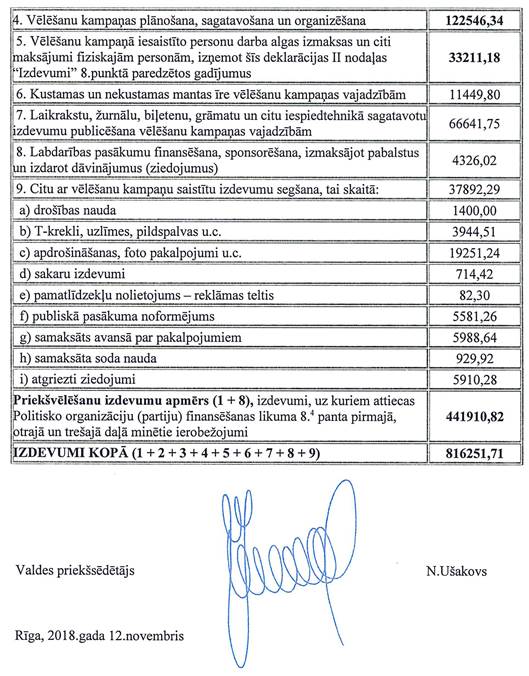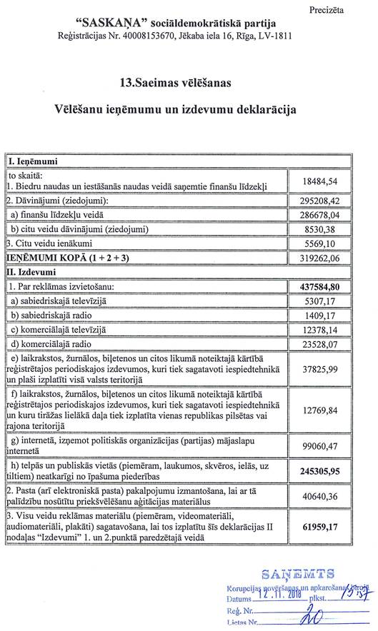 Politiskās partijas "Saskaņa" sociāldemokrātiskā partija, reģ. Nr. 40008153670, precizēta vēlēšanu ieņēmumu un izdevumu deklarācija
