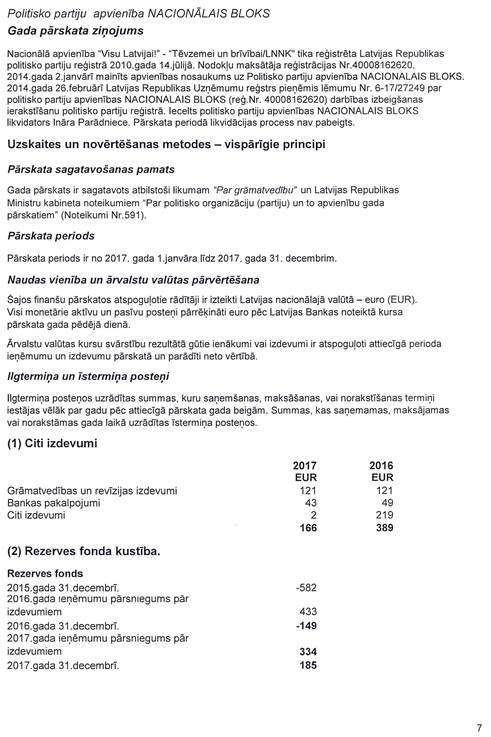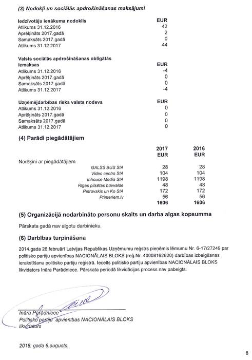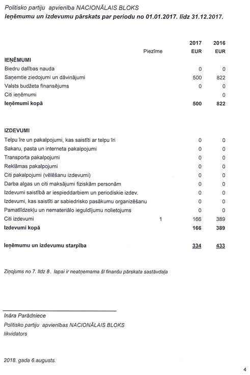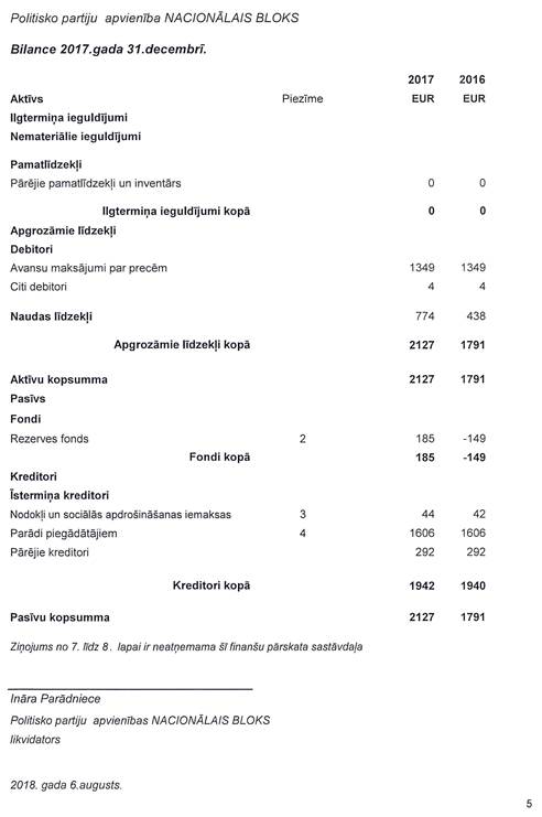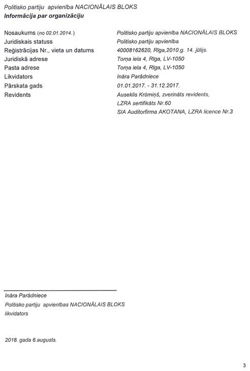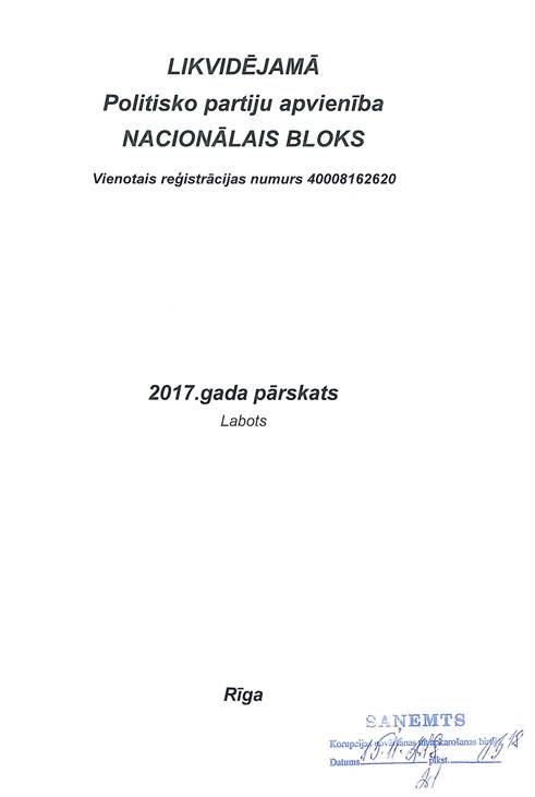 Likvidējamās Politisko partiju apvienības "Nacionālais bloks", reģ. Nr. 40008162620, precizēts gada pārskats par 2017.gadu