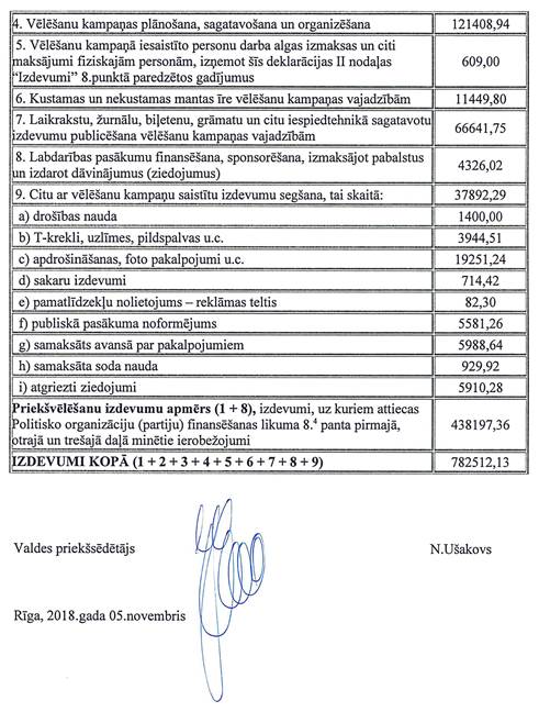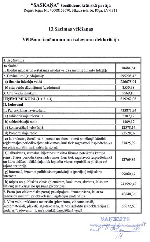 Politiskās partijas ""SASKAŅA" sociāldemokrātiskā partija", reģ. Nr. 40008153670, 2018.gada 5.novembrī iesniegtā vēlēšanu ieņēmumu un izdevumu deklarācija