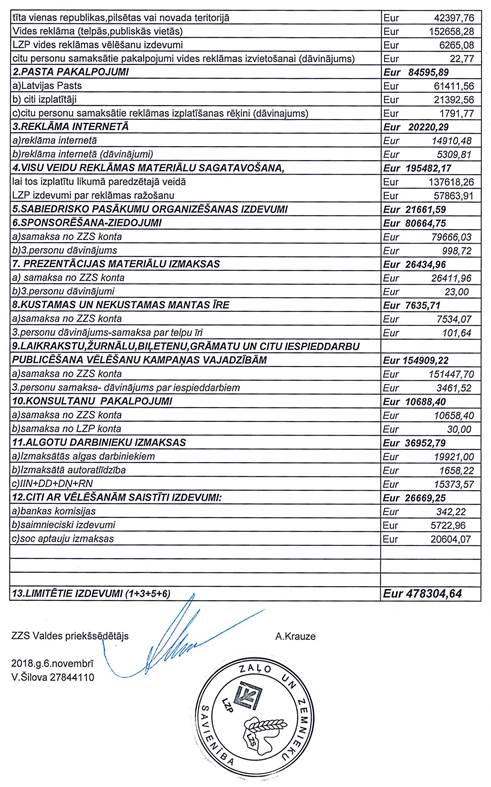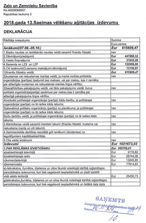 Politisko partiju apvienības "Zaļo un Zemnieku savienība", reģ. Nr. 40008068957, 2018.gada 6.novembrī iesniegtā vēlēšanu ieņēmumu un izdevumu deklarācija
